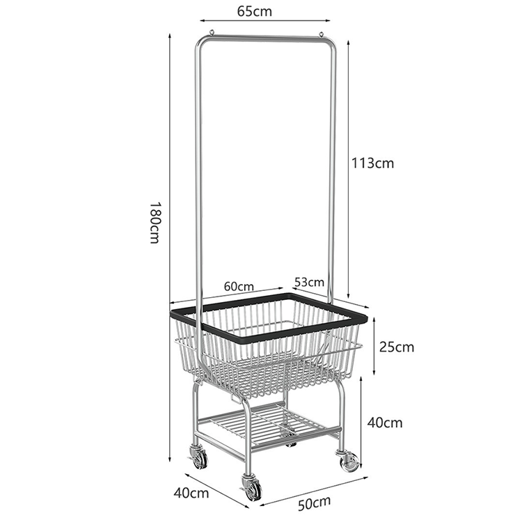 Panier à linge roulant, concierge de blanchisserie commercial avec panier de rangement en fil métallique, chariot à linge en métal avec barre de suspension