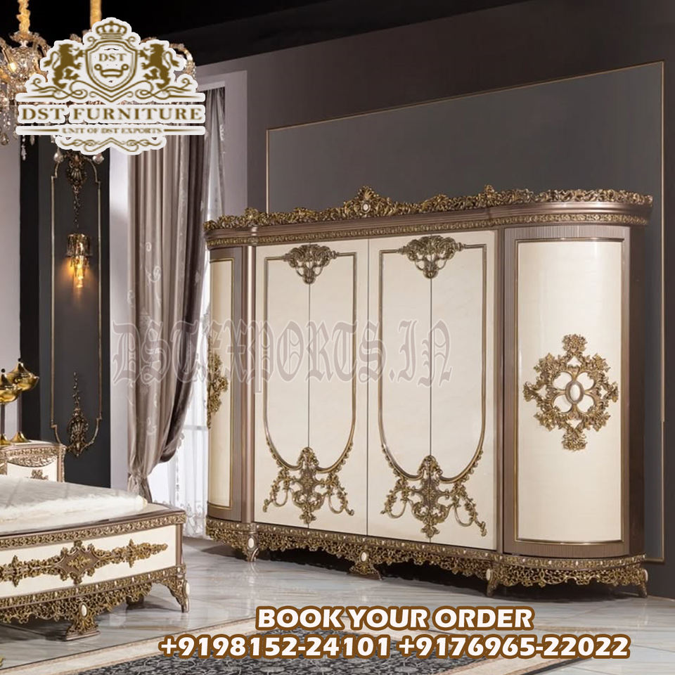 Romanian Bedroom Set With Dressing Table & Wardrobe Classic Walnut High Gloss Finish Bedroom Set Luxury Persian Style Bedroom
