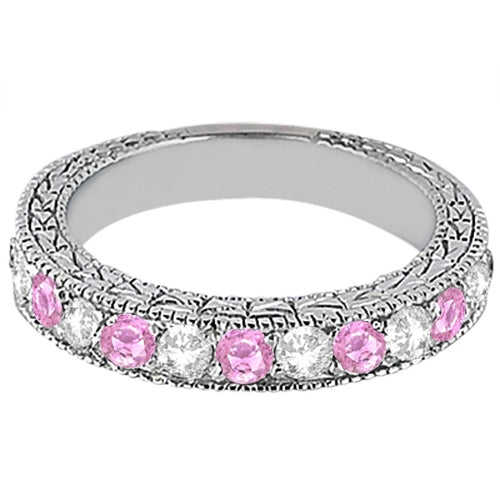 Bague de mariage romantique et délicate avec saphir rose antique de 1,05 ct et diamants, pierres taille poire en or blanc 14 carats
