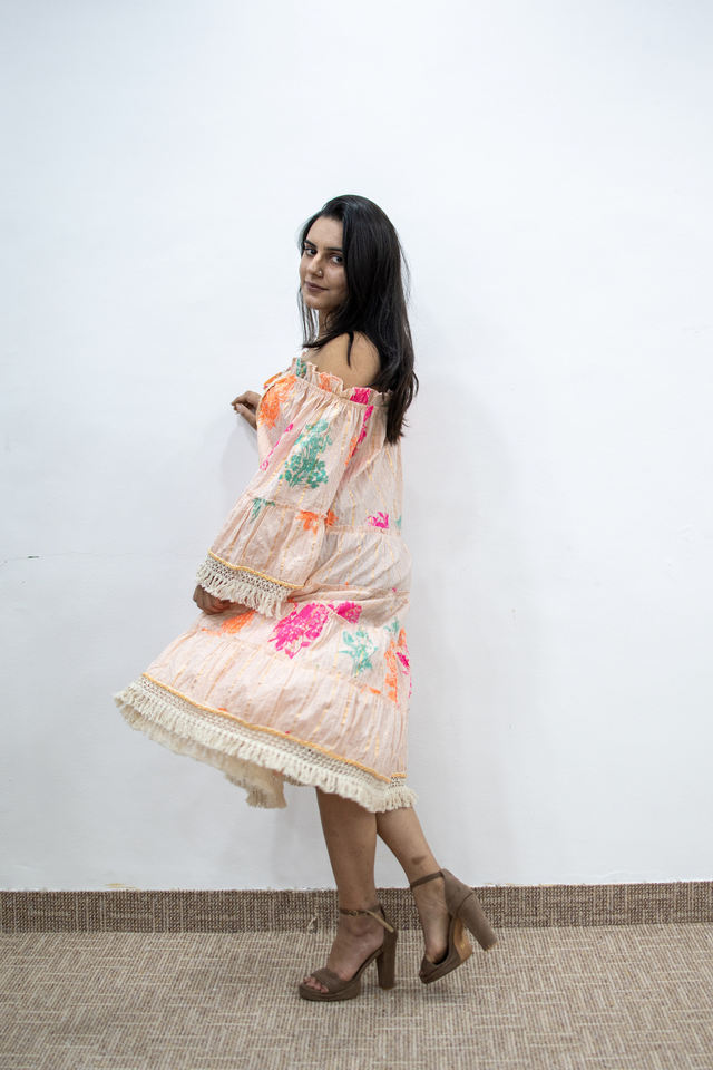 Robe bohème romantique à épaules dénudées à fleurs de pêche Robe à volants à franges en dentelle Robe de soirée d'été Robe romantique à fleurs de pêche