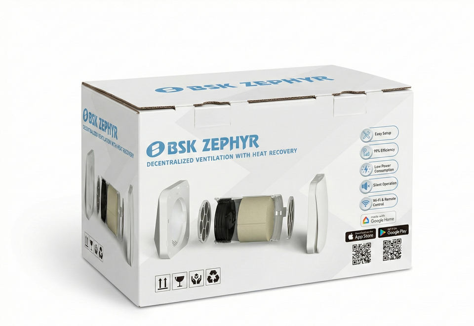 Ventilation à récupération de chaleur sans conduit BSK Zephyr WiFi, installation murale, avec application, minuterie et mode silencieux pour les maisons