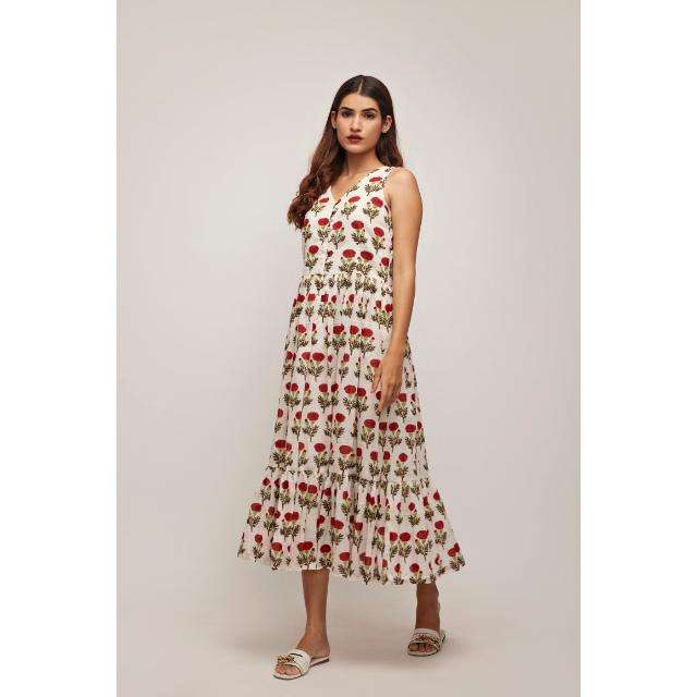 Robe longue évasée sans manches imprimée fleur de rose longueur de thé pour femmes