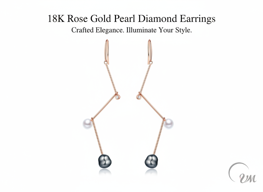 Boucles d'oreilles pendantes en or rose avec perles de forme unique, style classique, élégance distinctive pour une fête ou un cadeau du Nouvel An, unisexe