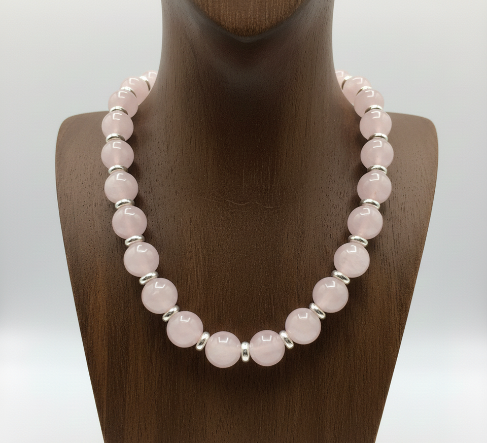 Rose Quartz Beaded Necklace Unisex 18-Inch Tibetan Silver Lock Hand-Knotted Geometric Design Trendy Gift Fashion Jewelry