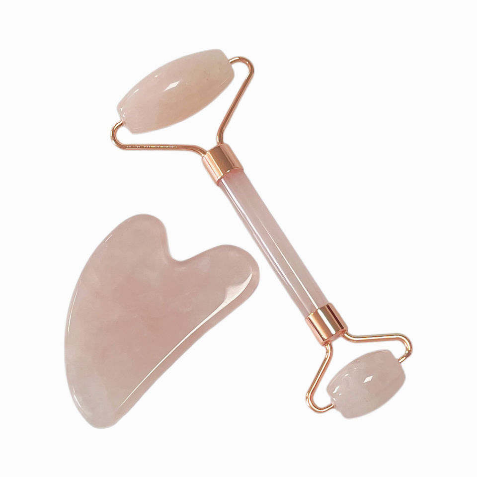 Ensemble Quartz Rose Jade Gua Sha Outil de Massage pour Soins de la Peau du Visage avec Application pour Bras, Jambes, Corps et Cou