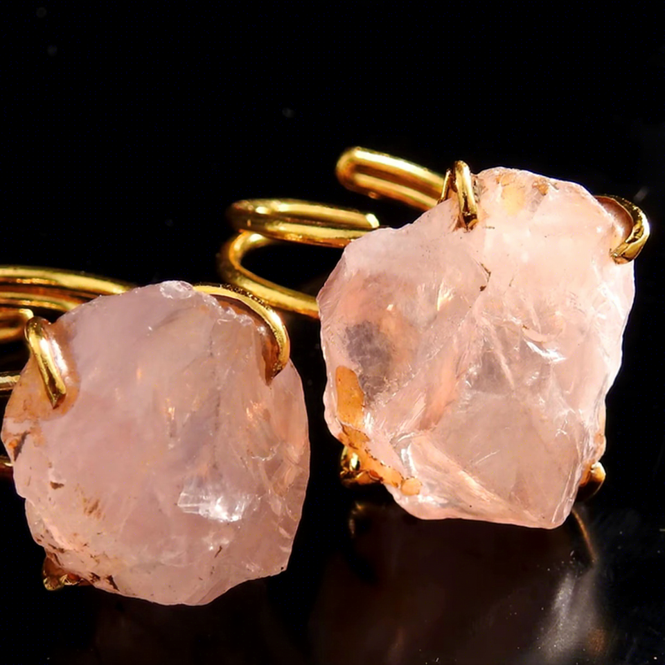 Bague de fiançailles réglable en quartz rose naturel brut, plaqué or 14 carats, enroulée de fil de cuivre, certifiée par une tierce partie, style décontracté/sportif