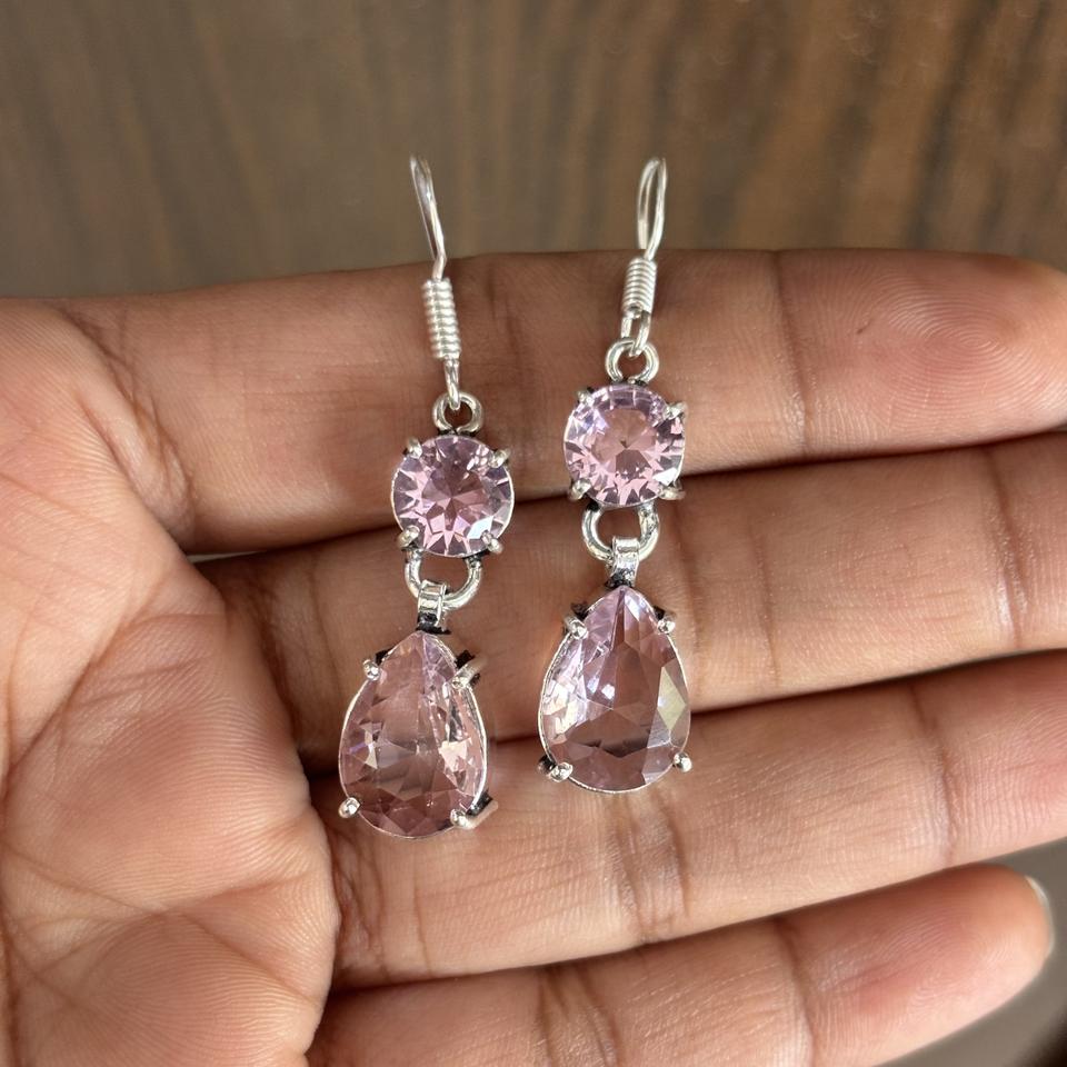 Boucles d'oreilles en pierre précieuse de quartz rose avec anneaux en laiton, design épais et léger pour les anniversaires des femmes