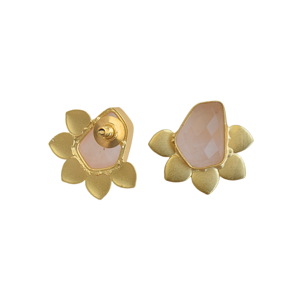 Boucles d'oreilles clous florales en laiton plaqué or faites à la main avec pierre semi-précieuse quartz rose, bijoux contemporains légers, vente en gros