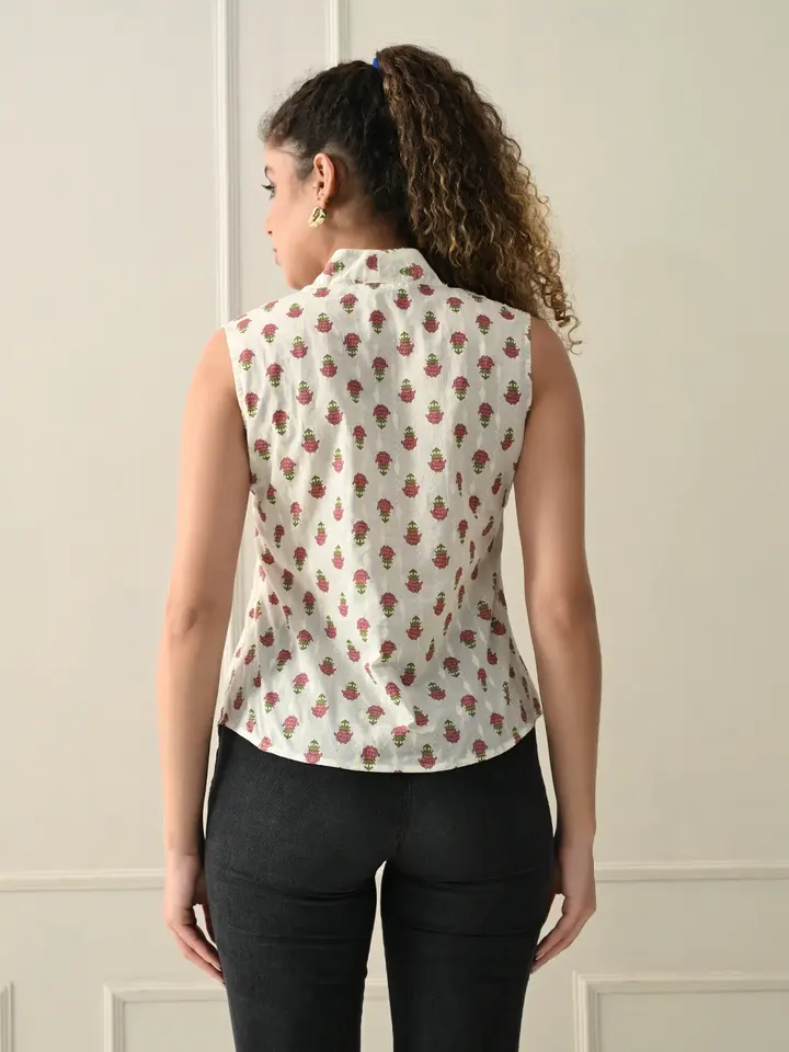 Gilet d'été Rosebloom Trendy Handblock Imprimé Top boutonné sans manches en coton 100% avec un design propre et sans col