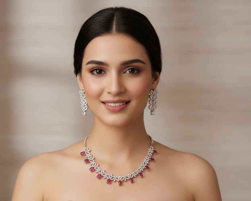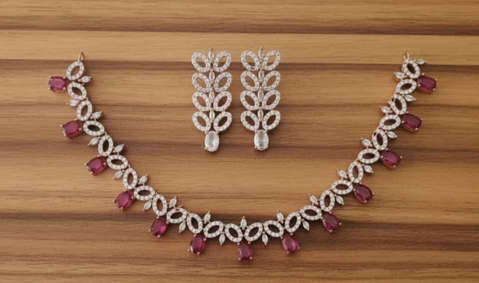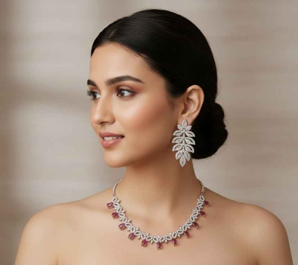 Ensemble collier et boucles d'oreilles en feuille de cristal rubis Roselia Conçu avec des cristaux ovales rose rubis disposés le long du collier