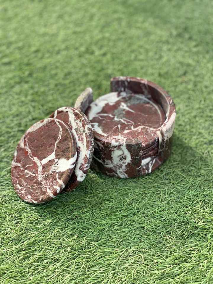 Ensemble de 6 sous-verres en marbre rouge Rosso Levanto avec support, sous-verres en pierre faits à la main