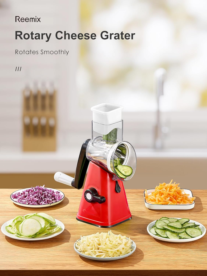 Rotary Cheese Grater with Handle Vegetable Shredder with 3 Blades Strong Suction Base Round Mandoline Slicer Food Chopper