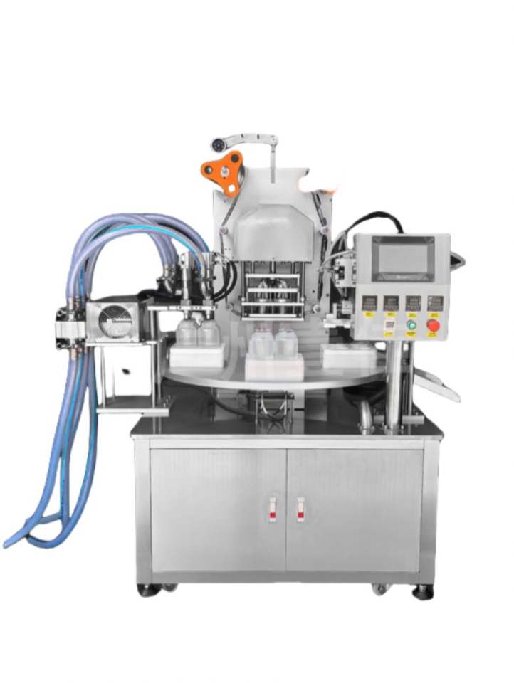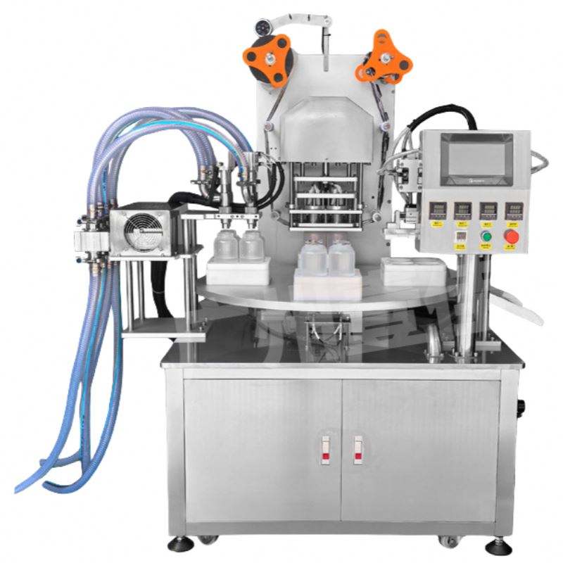 Machine de scellage rotative entièrement automatique et personnalisable pour gobelets en plastique, bouteilles et barquettes de gelée/lait
