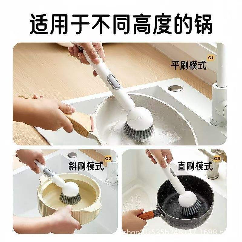 Brosse de nettoyage de cuisine rotative avec long manche pour casseroles et poêles, poils en nylon, design suspendu, vert et gris