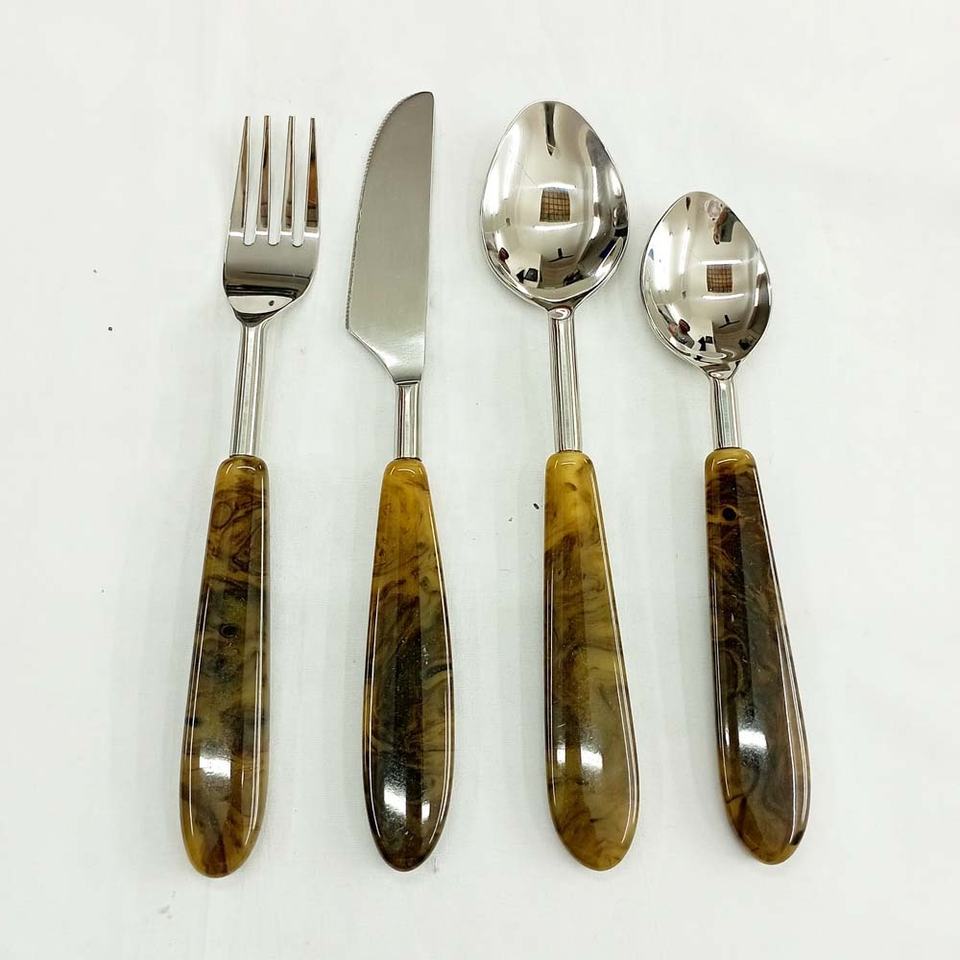Round Bamboo Look Long Resin Amazing Handle Cutlery Set Portugal Style Flatware Stainless Steel Gold Plated Cutlery Set