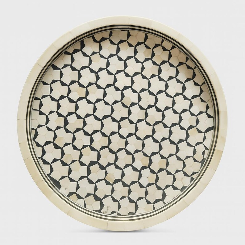 Plateau rond en os incrusté - Mosaïque géométrique noir et blanc | Plateau de service décoratif fait main | Table basse par PERFECT ENTERPRISES