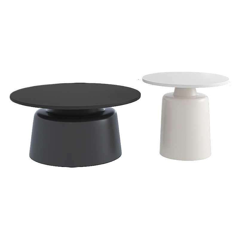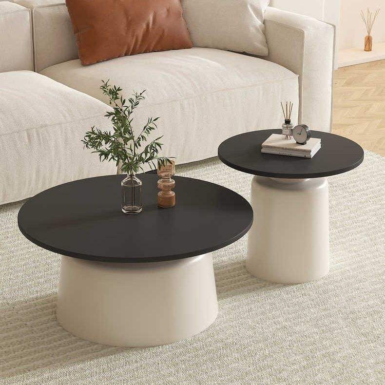Table basse ronde avec plateau en résine, base blanche peinte, design moderne pour salon