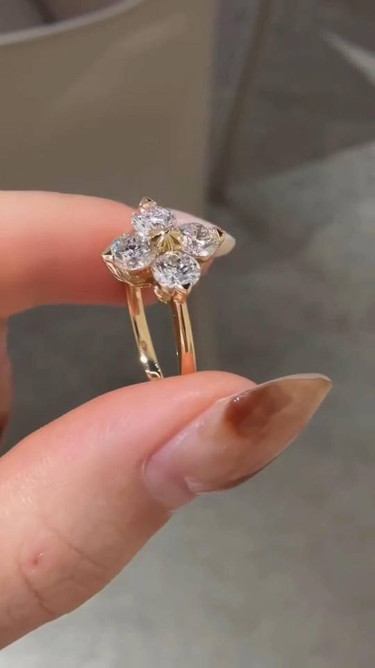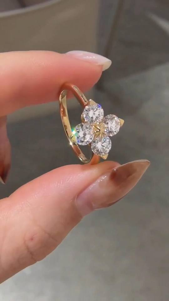 Bague florale luxueuse en diamant de laboratoire taille ronde pour femme, en or massif 14 carats, avec quatre pierres, idéale comme cadeau de promesse pour petite amie