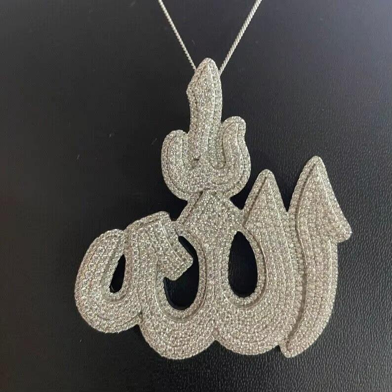 Collier pendentif pour homme en moissanite VVS taille ronde, style hip-hop, plaqué rhodium, motif Allah, HUMERA JEWELS