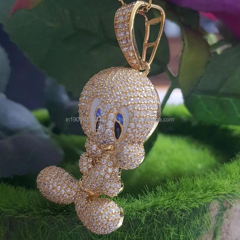 Pendentif Tweety Bird entièrement serti de diamants simulés de coupe ronde plaqué or jaune en argent sterling 925 Hip hop unisexe pour cadeau