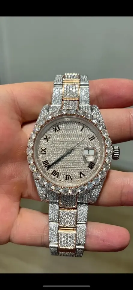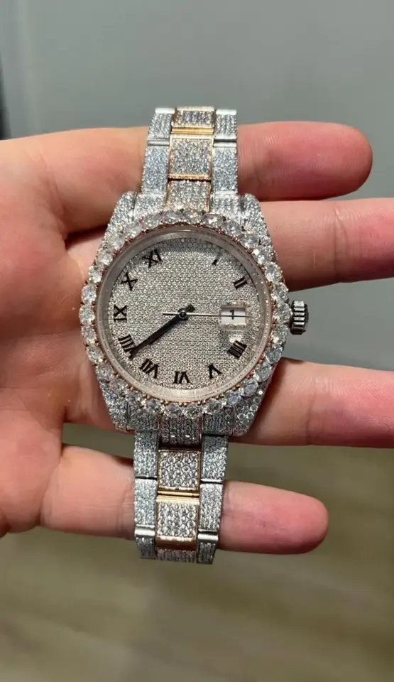 Montre de luxe pour homme avec cadran rond, bande or et argent, et verre de mode en quartz, ornée de diamants Moissanite VVS