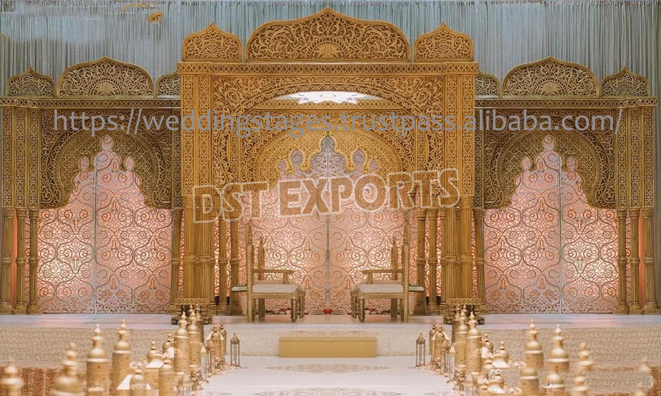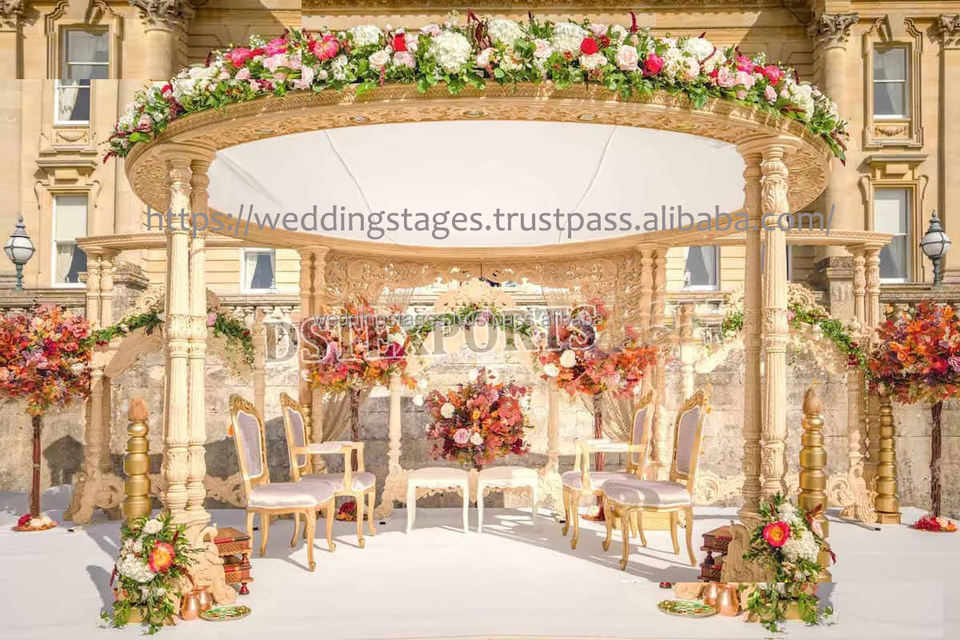 Mandap rond en fibre, fabrication DST Exports, mandaps traditionnels dorés sculptés pour mariages hindous, fabricants pour grands événements, lieux de réception, fêtes aux États-Unis