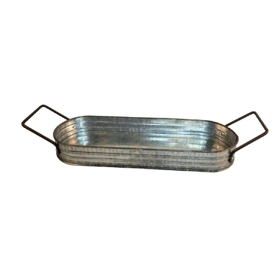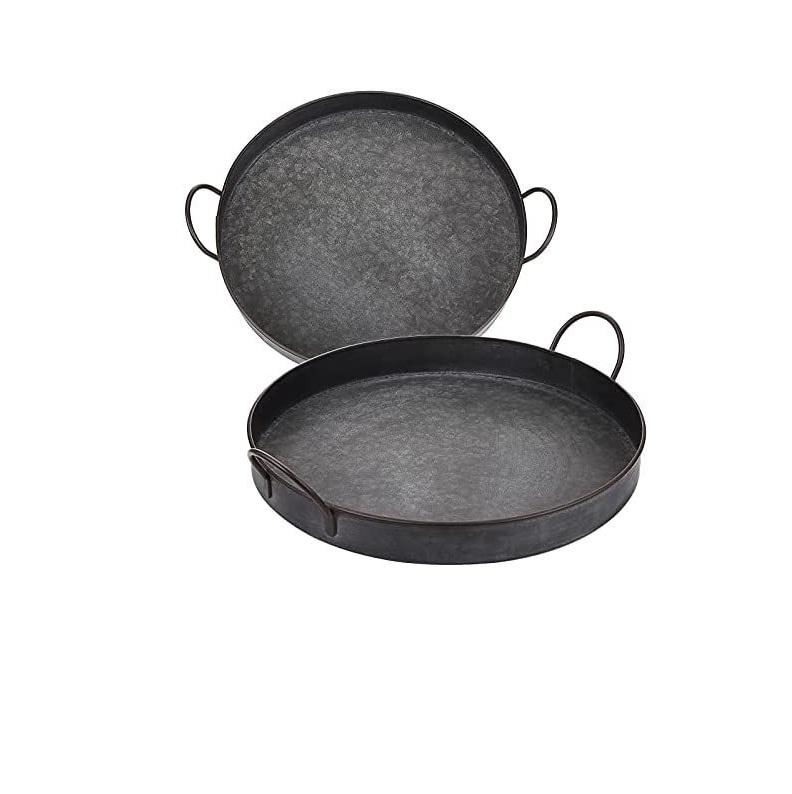 Plateau de service rond en métal galvanisé avec poignées en corde, style farmhouse, pour rangement décoratif et présentation alimentaire, pour usage domestique et hôtelier