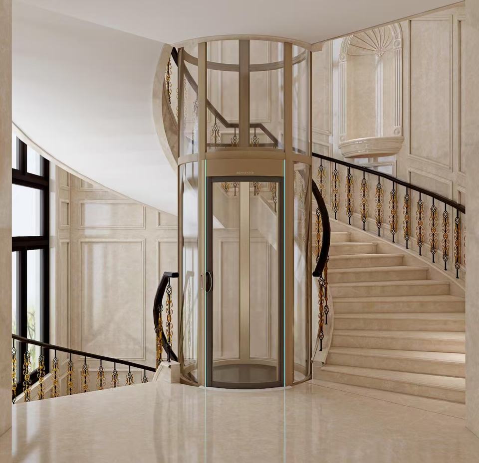 Ascenseur en verre rond 2-4 personnes Traction Drive Passager Résidentiel Escalier en colimaçon avec ascenseur touristique semi-circulaire