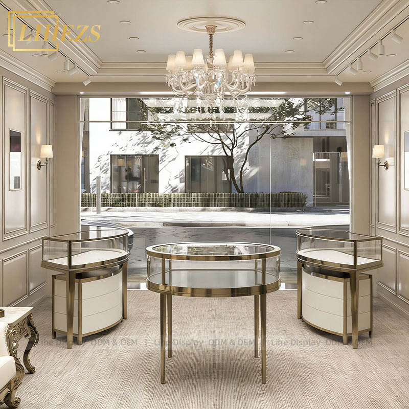 Vitrine ronde pour bijoux, comptoir d'exposition incurvé, mobilier de magasin, design d'intérieur, solutions de mise en valeur commerciale