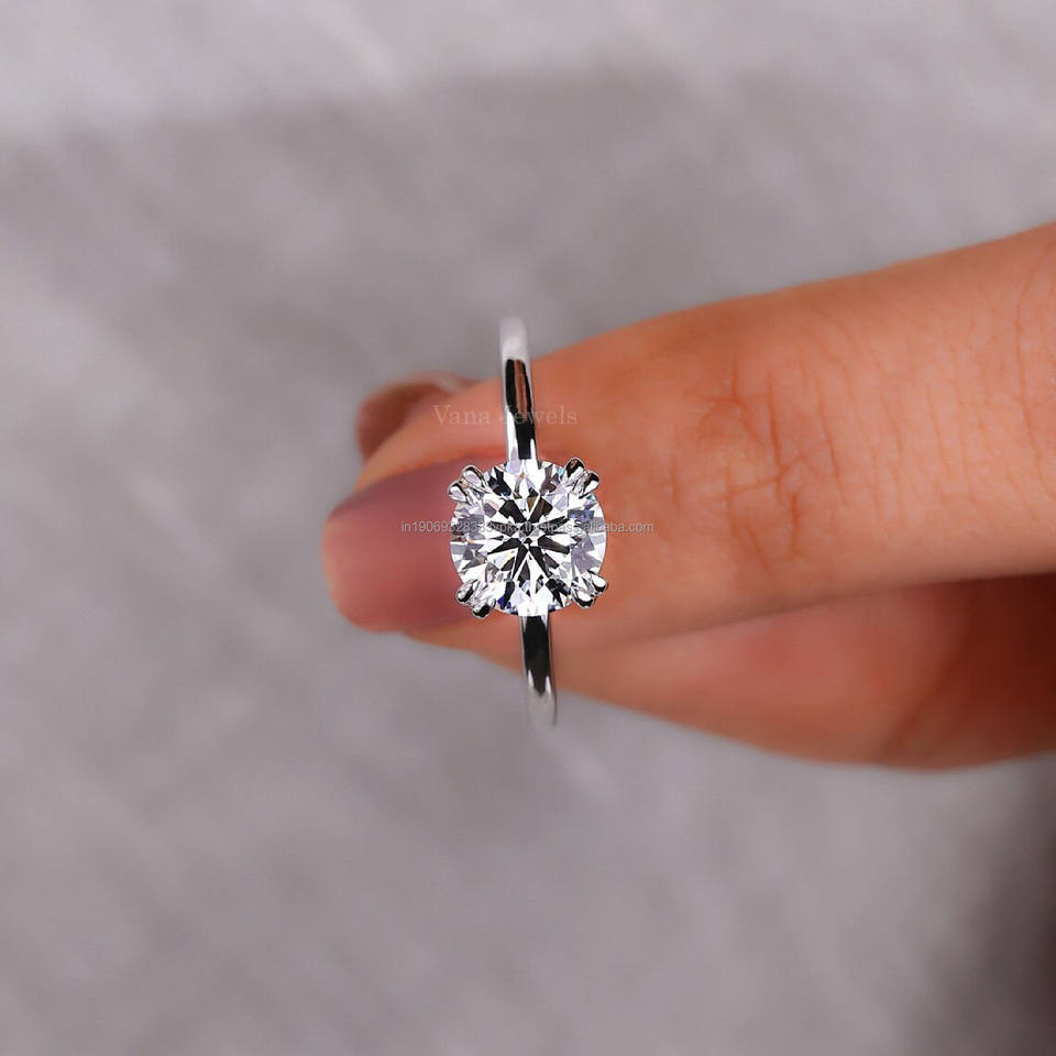 Bague ronde en diamant cultivé en laboratoire en or blanc serti d'une double griffe pour bague de fiançailles anniversaire cadeau de promesse pour elle