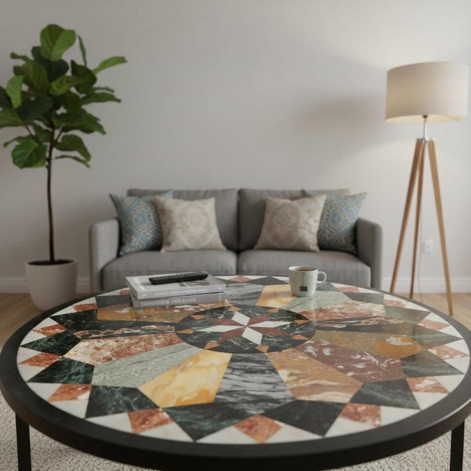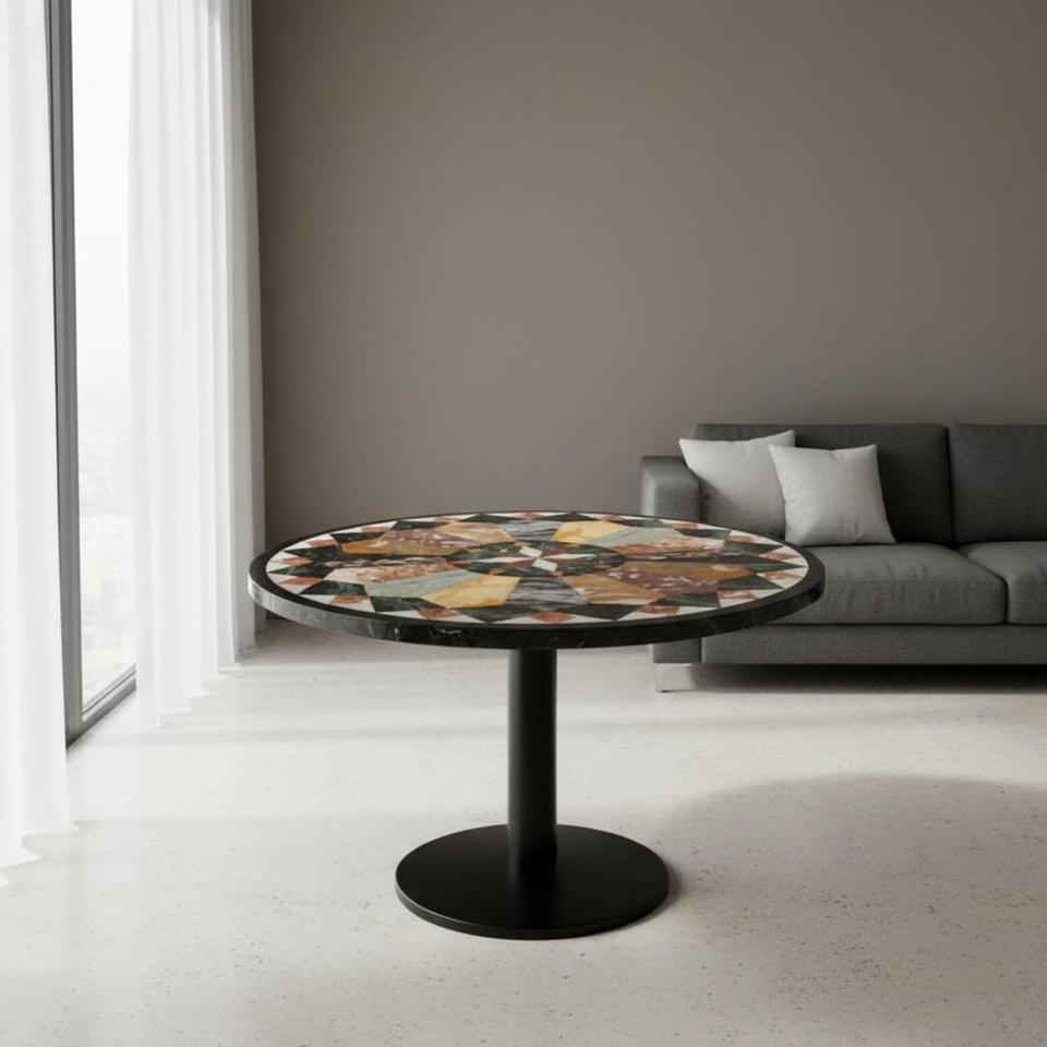 Table ronde en marbre incrusté, table en mosaïque de pierre faite à la main, table de salle à manger et table basse de luxe pour la maison, l'hôtel et l'intérieur