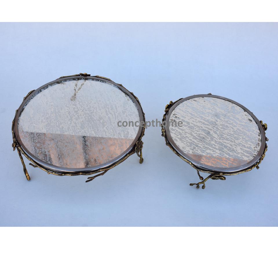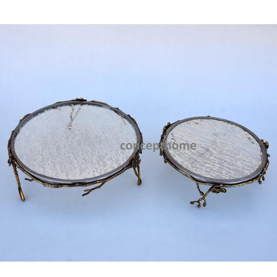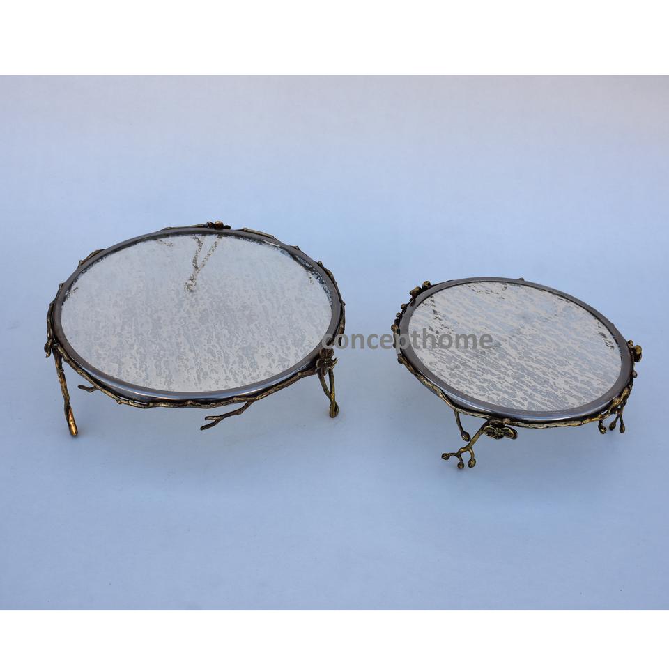 Support à gâteau rond avec plateau miroir doré et pieds à motif floral pour la présentation de desserts de mariage et la mise en scène de tables royales
