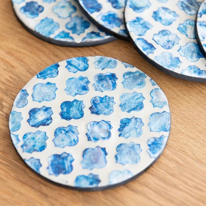 Ensemble de dessous-de-verre ronds en nacre avec mosaïque florale bleue, dessous-de-verre en coquillages faits à la main, accessoire de protection de table décoratif