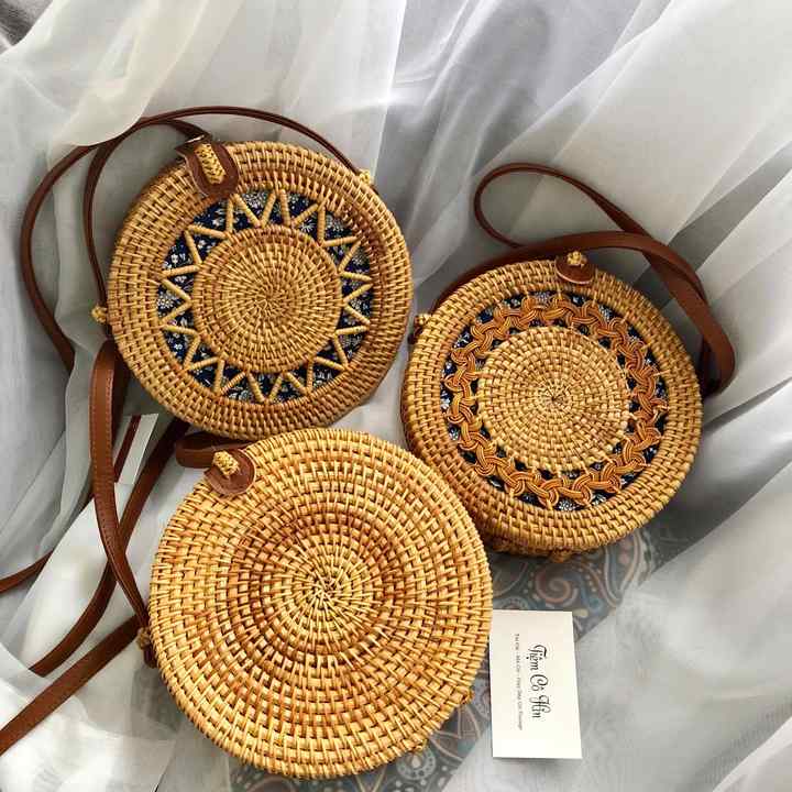 Sac rond en rotin de Bali avec poignée en cuir, sac à main tissé naturellement fait main, fabricant en gros d'usine au Vietnam, exportation