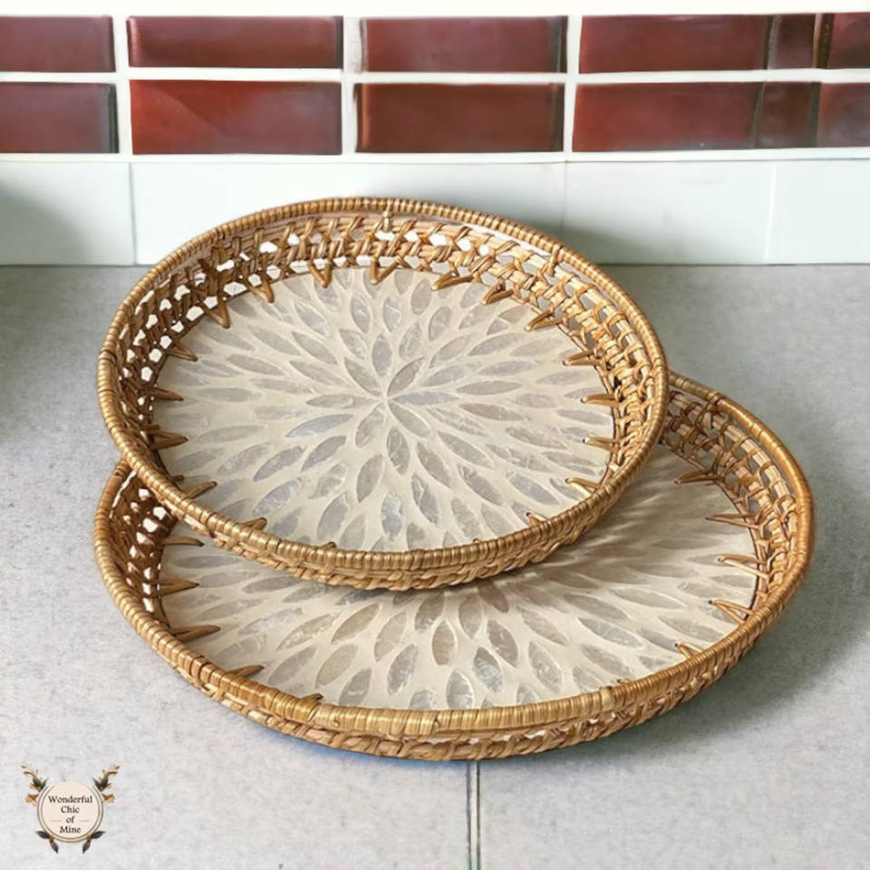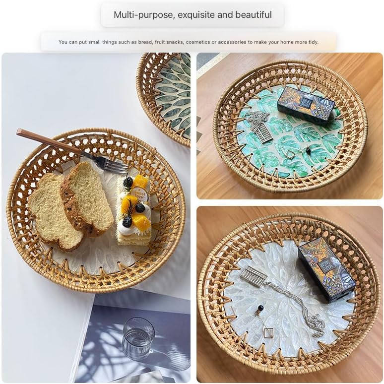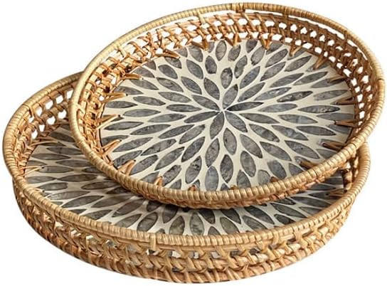 Plateau de service rond en rotin avec incrustation de nacre | Plateau en mosaïque tissé à la main, plateau décoratif en osier laqué, panier à nourriture (noir)