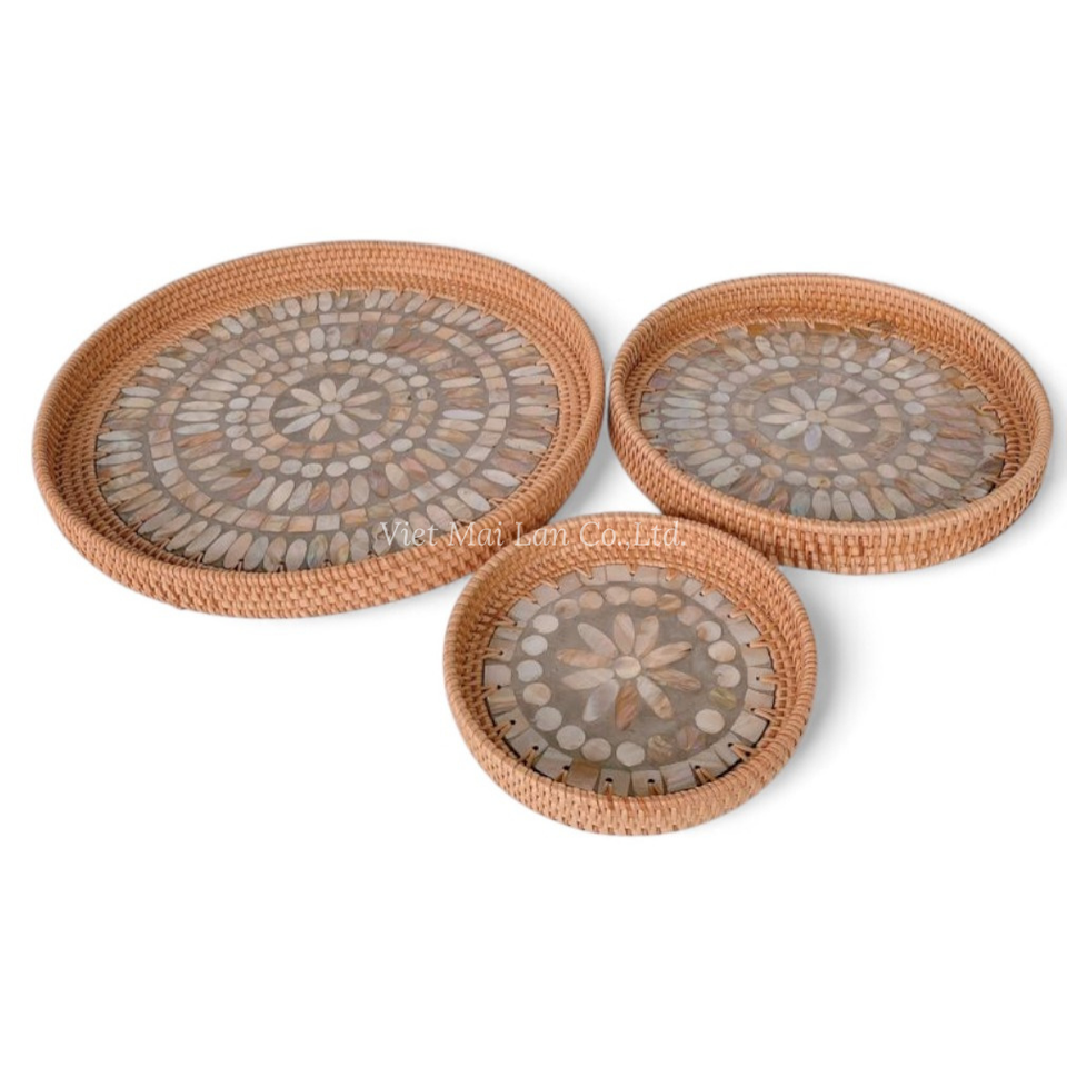 Plateau rond en rotin avec incrustation de nacre, vente en gros, vaisselle décorative pour hôtels, restaurants, export