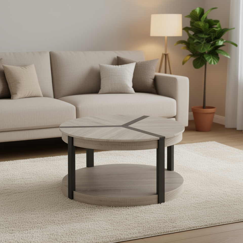 Table basse spacieuse à 2 niveaux en bois et caoutchouc avec étagère de rangement, 34.5 pouces