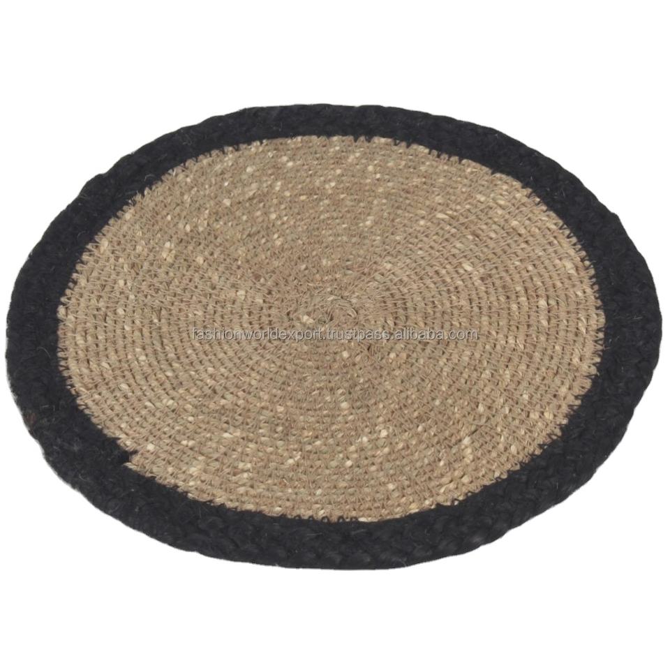 Tapis de table rond en jonc de mer avec bord noir Napperon de salle à manger écologique pour un décor rustique à votre table à manger ou à votre cuisine