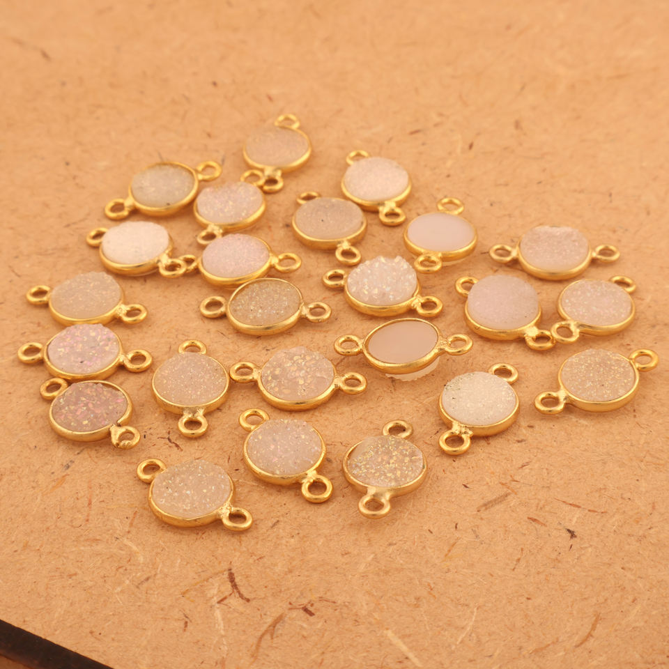 Connecteur à double caution de forme ronde en sucre blanc naturel druzy faisant connecteur de bracelet Connecteurs de réglage de lunette plaqués or 18 carats
