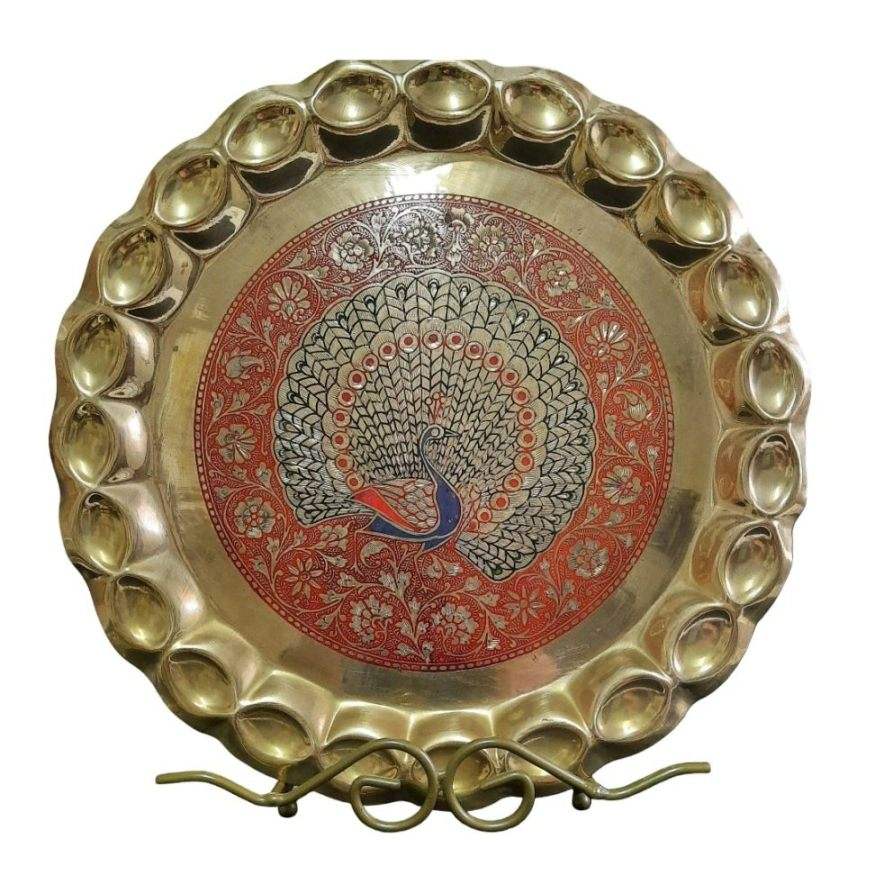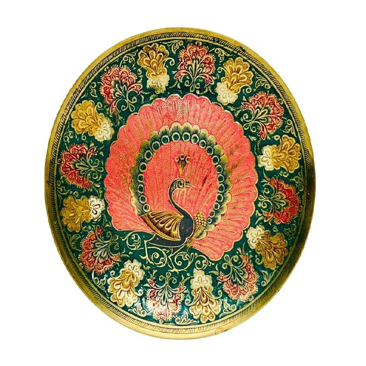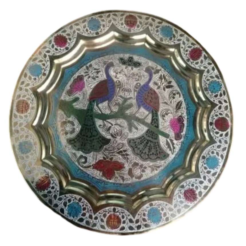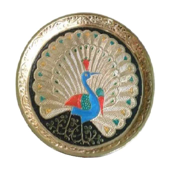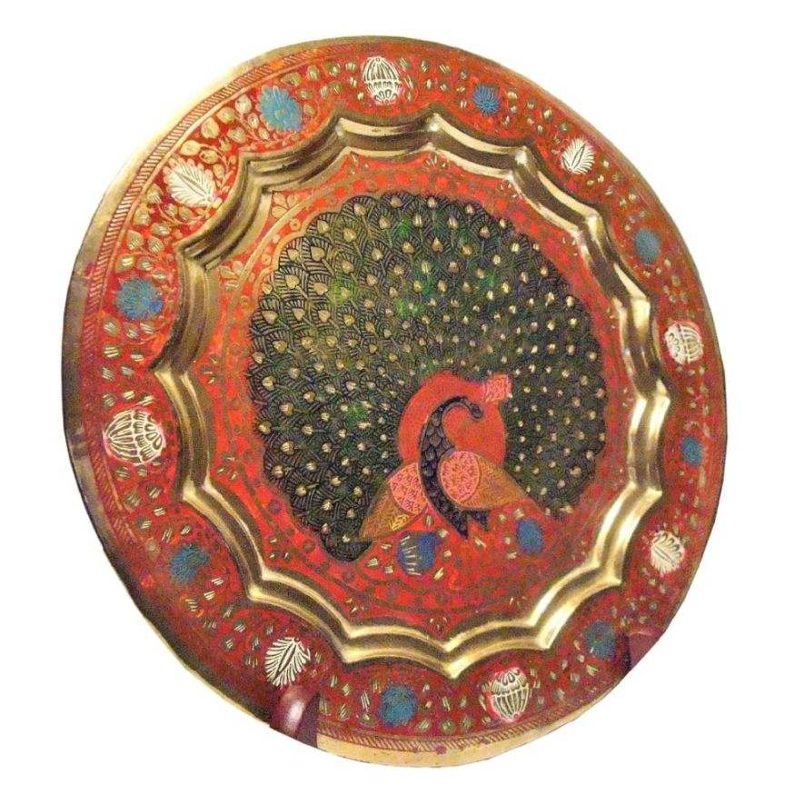Assiettes rondes en laiton pur de haute qualité, assiettes rondes en métal pour restaurant et hôtel avec motif de paon pour une utilisation en cuisine