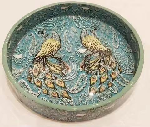 Plateau de service rond unique, design sculpté à la main, imprimé, plateau en bois personnalisé de designer unique