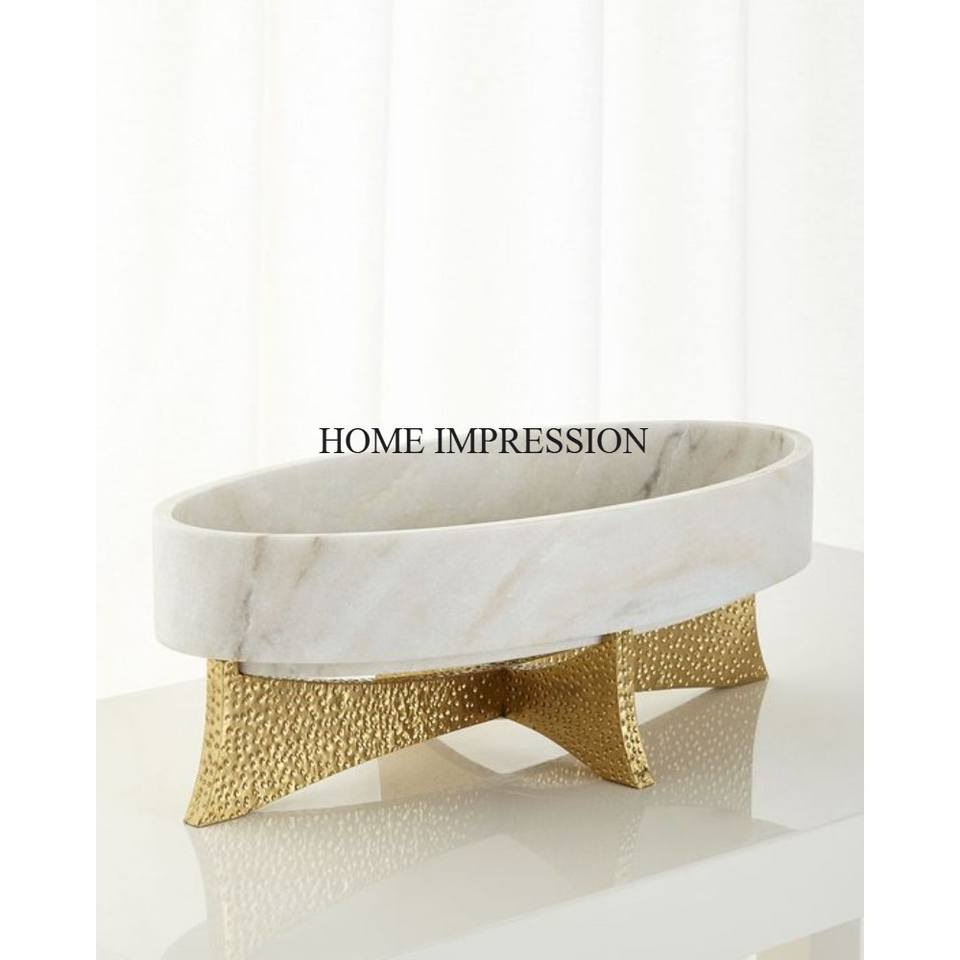 Bol en marbre blanc de forme ronde avec base en métal plaqué or pour mariage et fêtes, centre de table, bol de service alimentaire