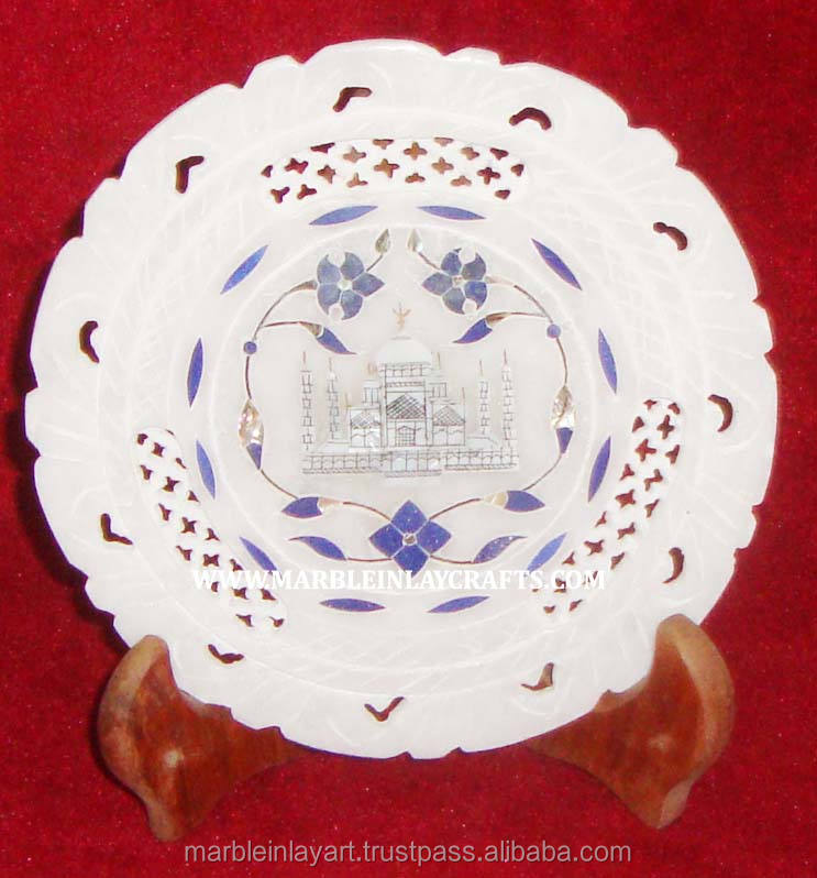 Assiette décorative ronde en marbre blanc avec incrustation, design unique et incrustation Taj Mahal, fabriquée par le meilleur designer indien pour un usage cadeau