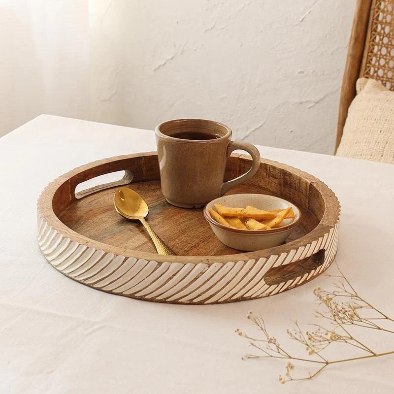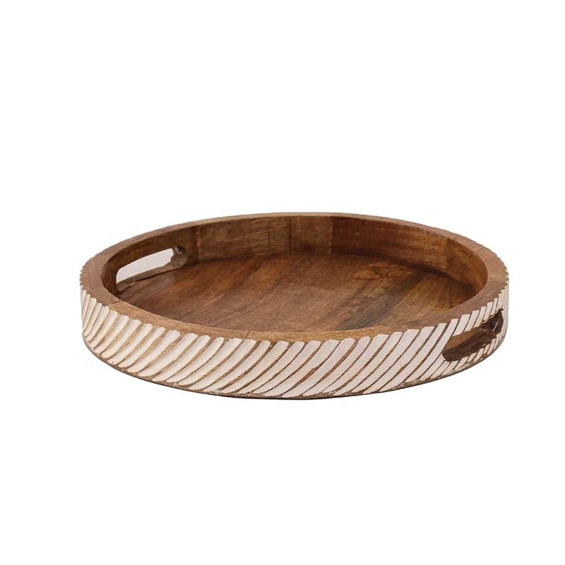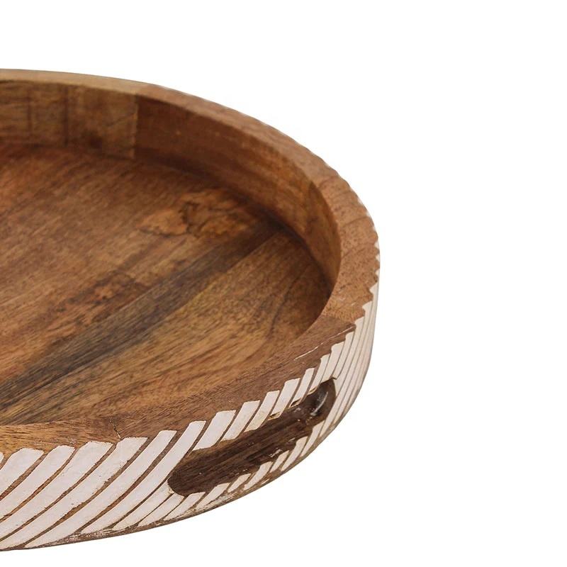 Plateau de service rond en bois - Décoratif, durable, finition polie, contact alimentaire sûr pour l'hôtellerie, la restauration et la cuisine