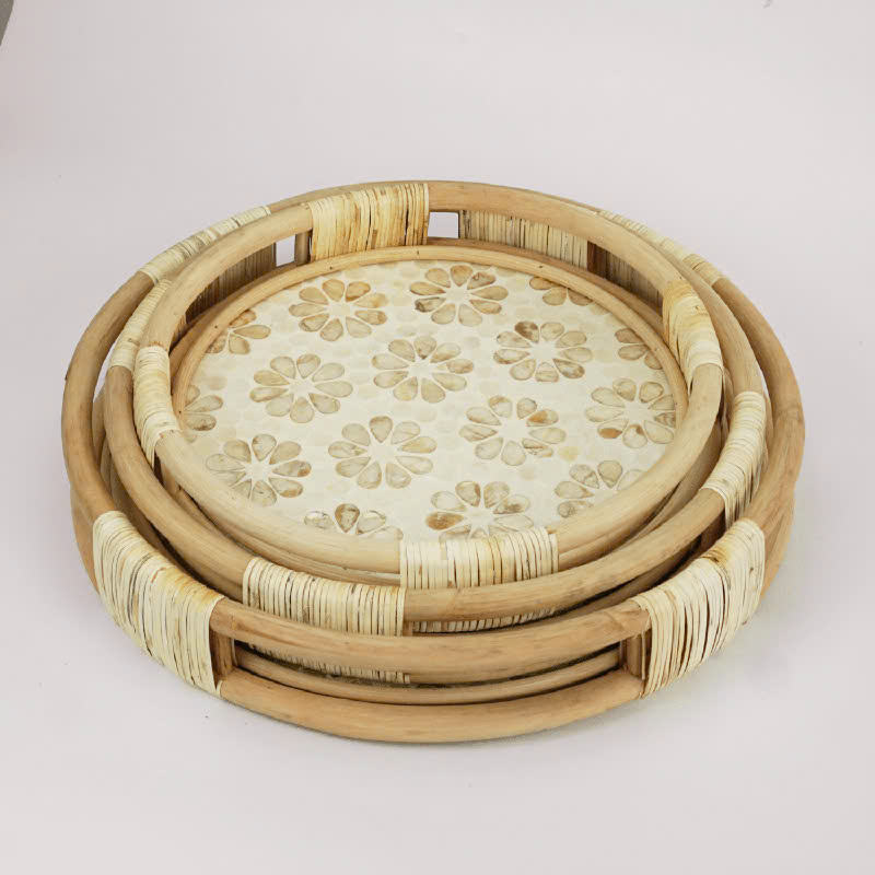 Round rattan tray combined with mother-of-pearl inlaid wooden bottomProduct name
