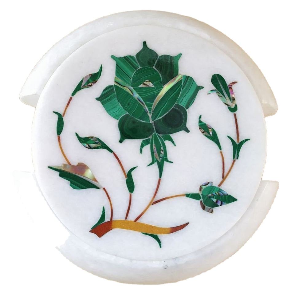 Dessous de verre ronds en marbre blanc avec incrustation de fleurs vertes faits à la main en pierre naturelle sous-verre décoratif en marbre