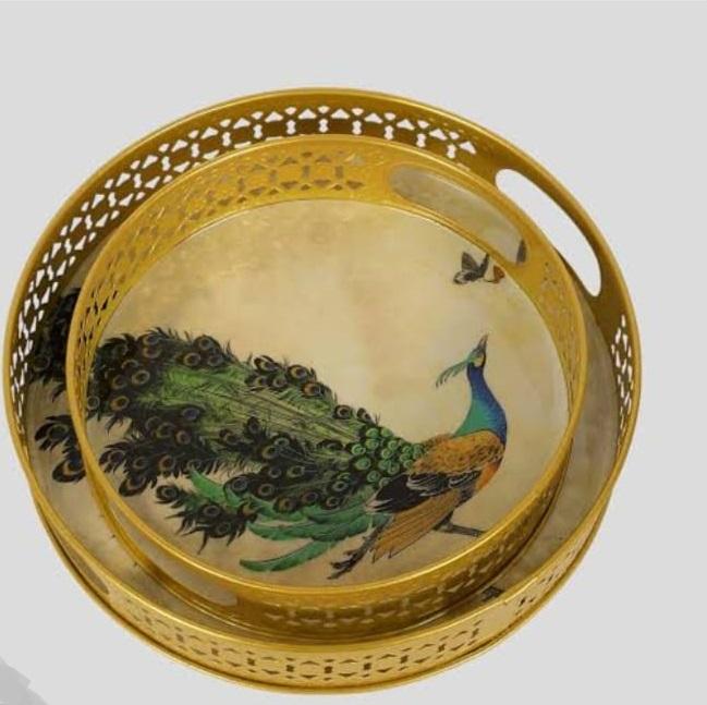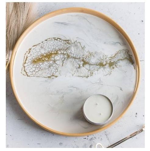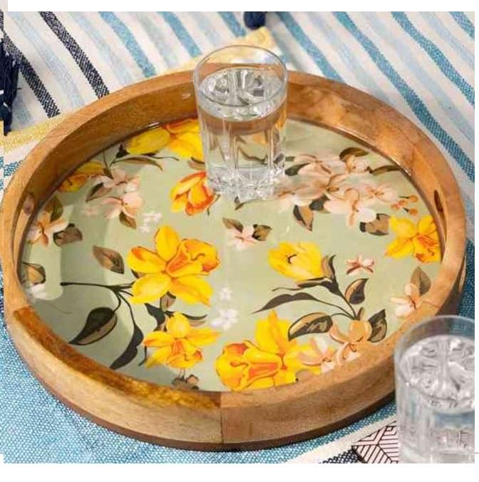 Plateau de service rond gravé pour restaurant et hôtel, en bois, pour café, thé, pain, avec finition émaillée