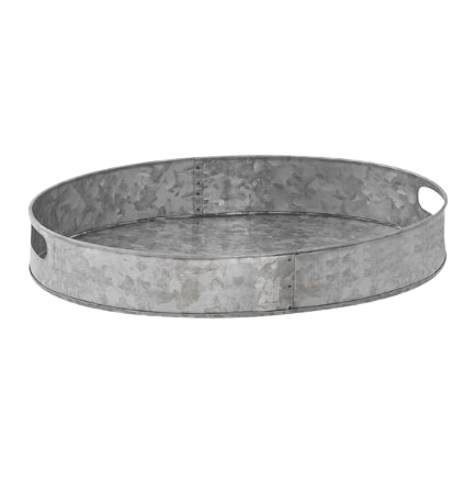 Plateau en métal de forme arrondie Poignée de designer Plateau en métal galvanisé Ustensiles de cuisine de couleur grise et plateau d'hôtel avec poignée en métal