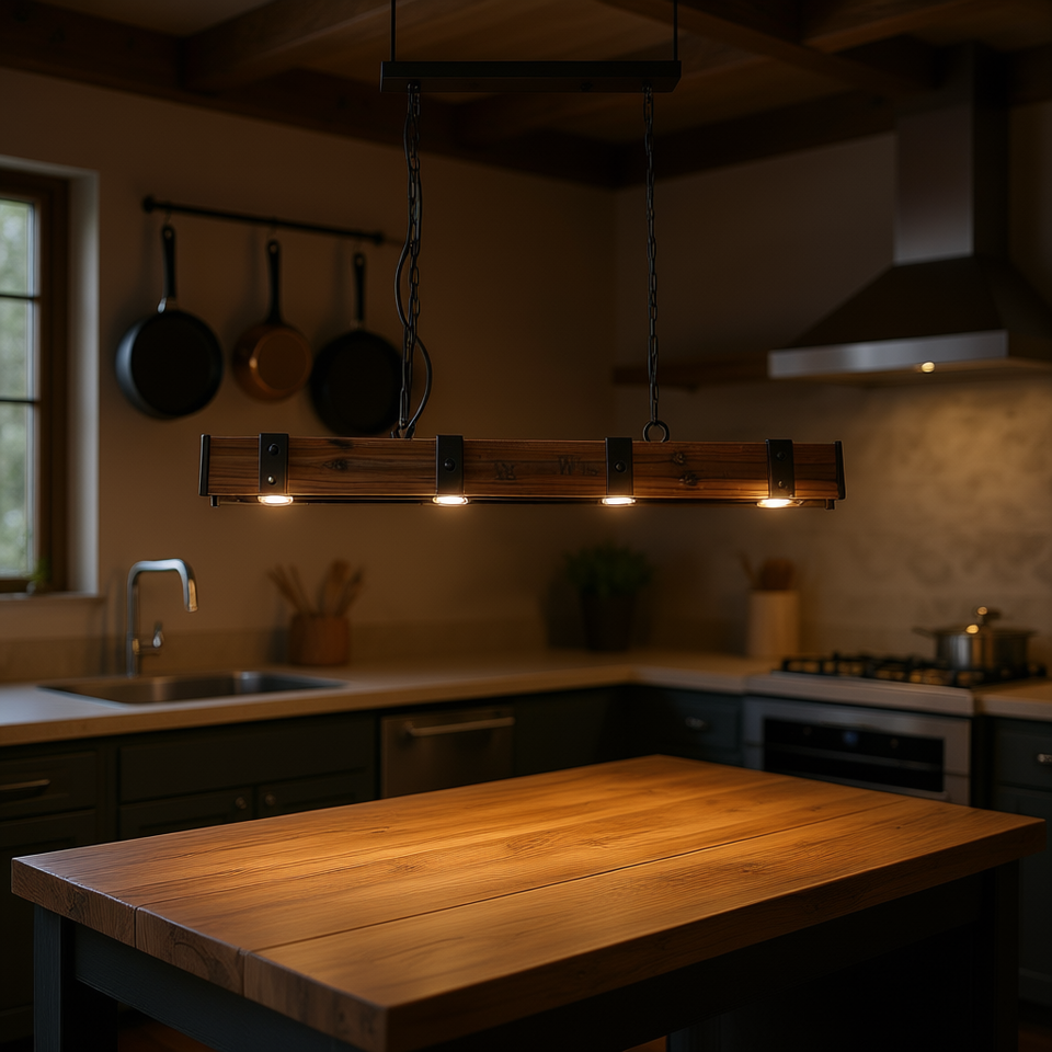 Lustre linéaire LED Rowen Rustic à 4 lumières, en bois et métal, pour îlot de cuisine