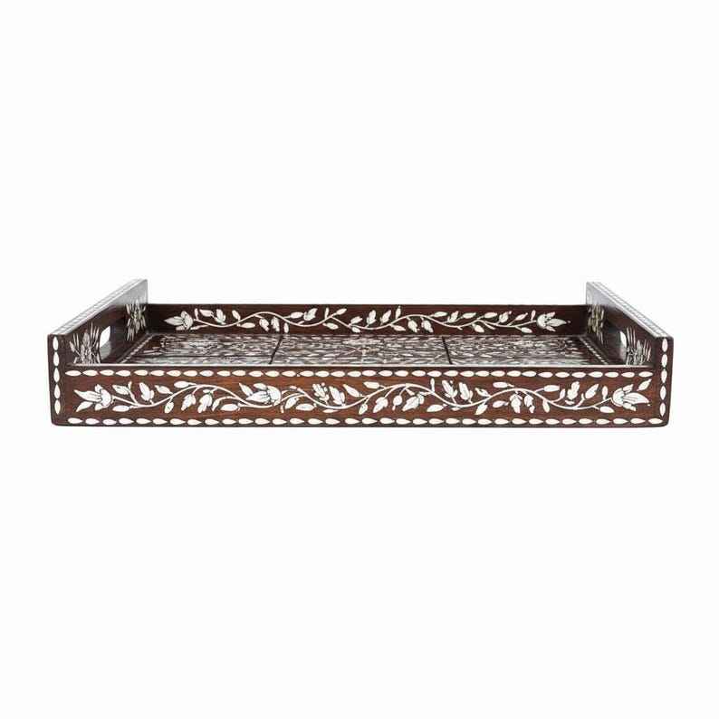 Plateau de service rectangulaire de luxe personnalisable de qualité commerciale, fait main par des artisans royaux, avec incrustations en os, compatible lave-vaisselle